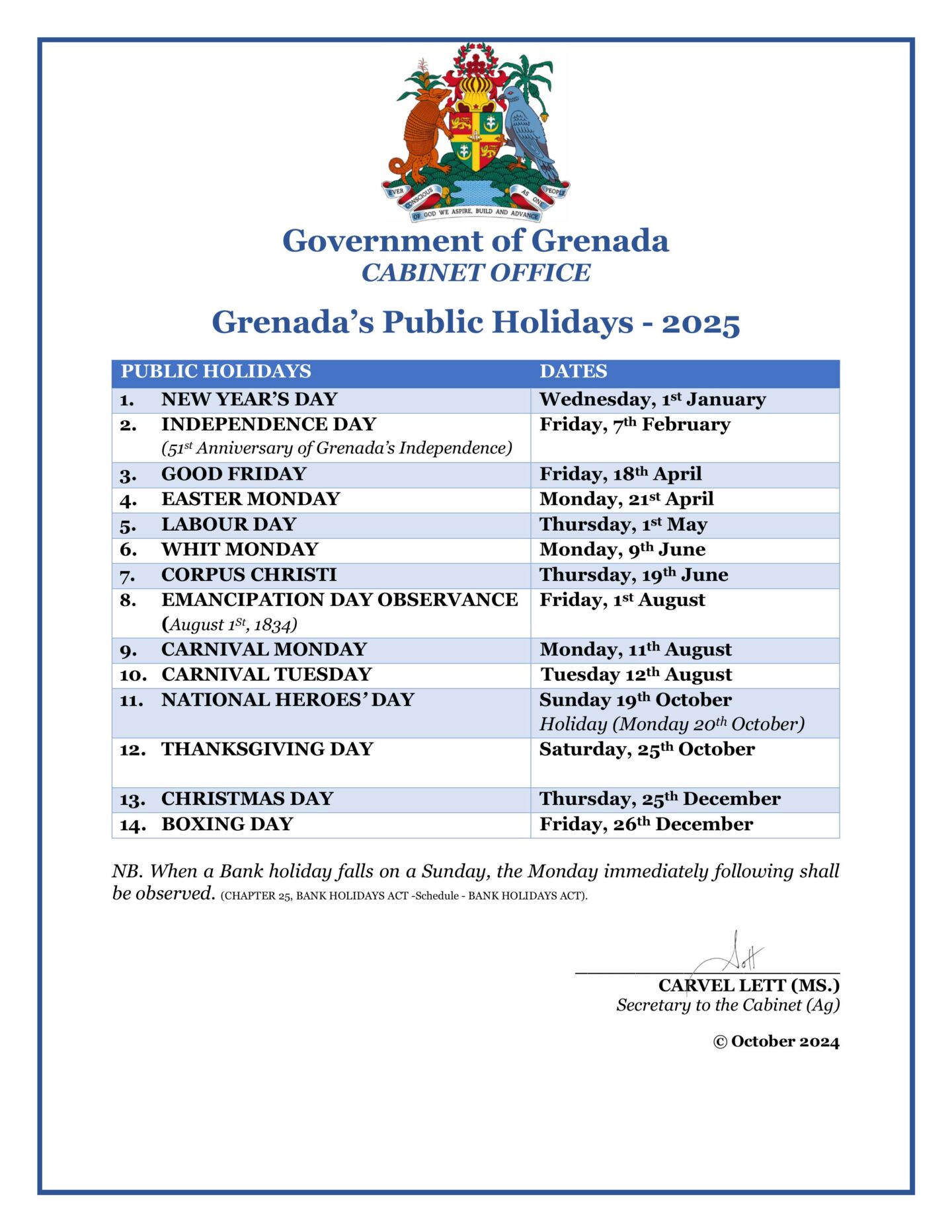 The list was signed by Secretary to the Cabinet Carvel Lett and dated October 2024. “The first Monday in August, which shall be known and referred to as Emancipation Holiday,” said the schedule for the Bank Holiday Act, which is normally published the last week of the year or the first week of the following year.