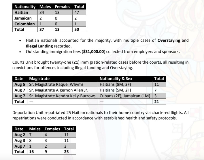 NASSAU| Between August 1 and August 8, immigration operations resulted in 50 apprehensions, 21 court convictions, and the repatriation of 25 individuals to their home country. During the week, the Enforcement Unit conducted targeted apprehension exercises across New Providence, focusing on individuals in breach of the Immigration Act. These operations included routine status checks and responses to public intelligence, and were supported by partner agencies, including the Royal Bahamas Police Force.