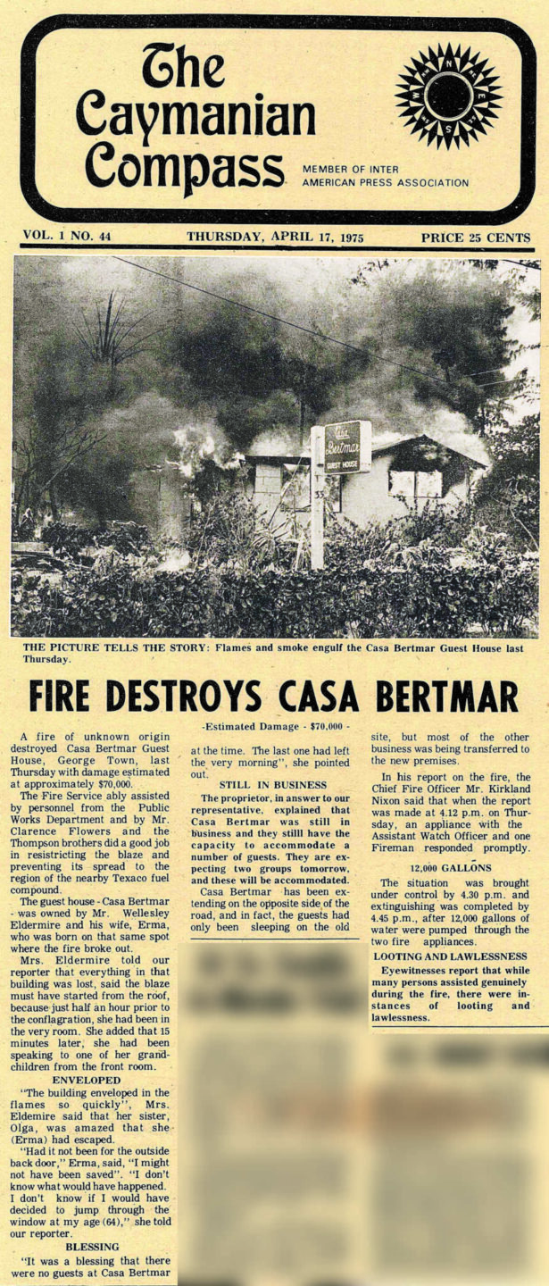 About a month after reporting on a fire at Palm Grove, the 17 April 1975 edition of The Caymanian Compass carried a story with a striking photo of flames and smoke engulfing the Casa Bertmar Guest House, which was owned by Wellesley and Erma Eldemire. A fire of unknown origin caused about $70,000 in damages. Everything in the building was lost, according to Erma, who had been born on the spot where the fire broke out, but they were able to accommodate guests at their other site across the road. Unfortunately, eyewitnesses said that while there were people who were genuinely assisting during the fire, there were instances of looting and lawlessness.