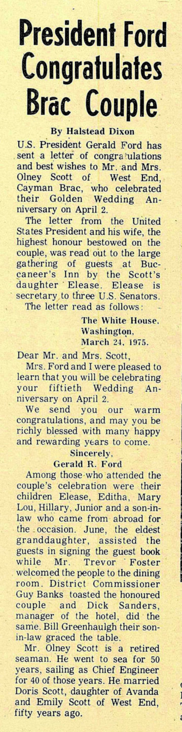 Another front-page story was about US President Gerald Ford congratulating Olney and Doris Scott on their golden wedding anniversary. Ford sent a letter on behalf of himself and his wife, Betty, saying they “were pleased to learn that you will be celebrating your fiftieth Wedding Anniversary on April 2”, adding “may you be richly blessed with many happy and rewarding years to come”. The Scotts’ daughter, Elease, who read the letter out at the celebratory gathering, was secretary to three US senators.