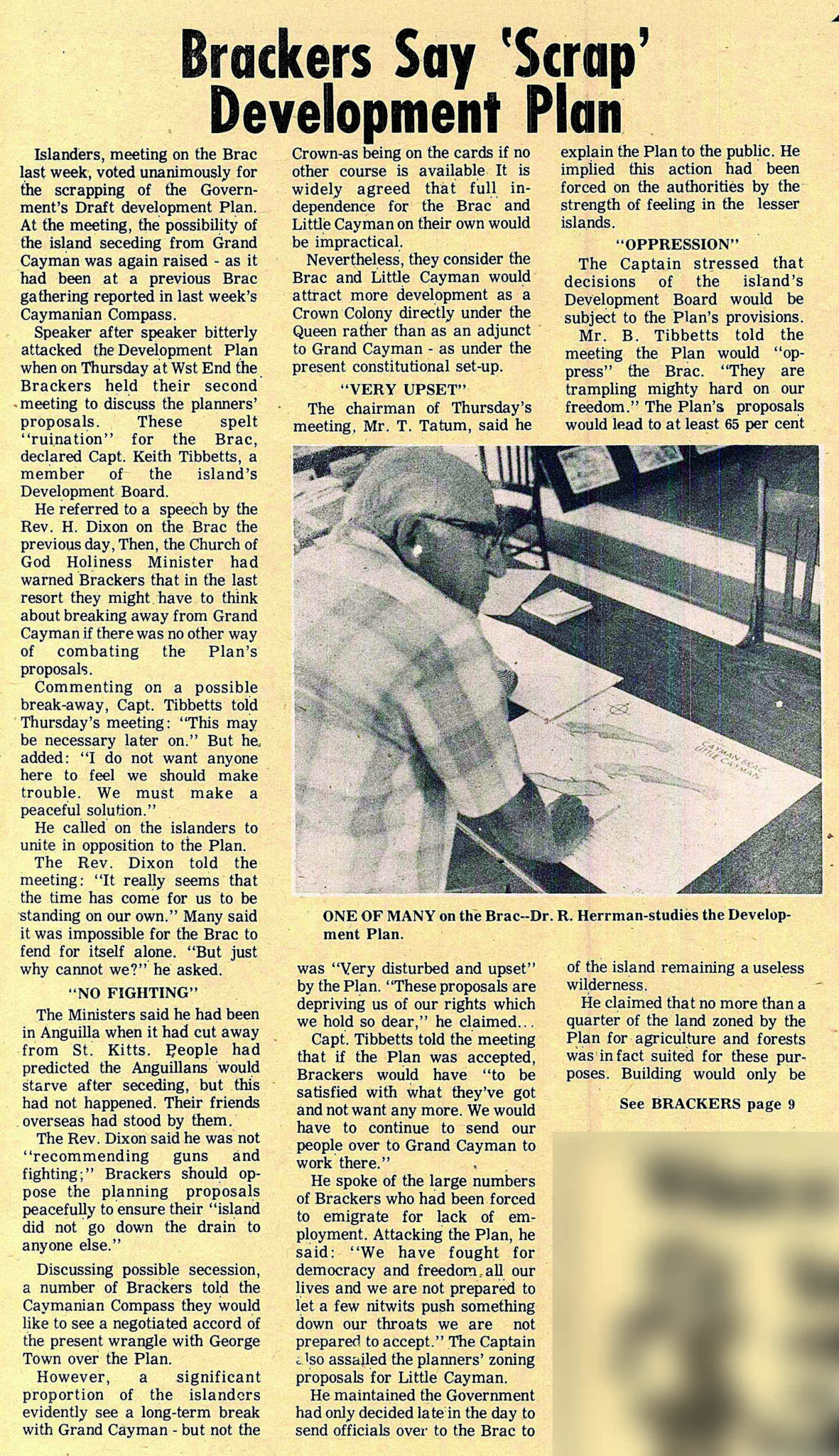 Following up on the previous week’s story about Brackers meeting on the draft Development Plan, the Compass noted that in a subsequent meeting, the residents voted unanimously to scrap the plan. Once again, there were calls to secede from Grand Cayman, with the article noting, “Speaker after speaker bitterly attacked” the plan.