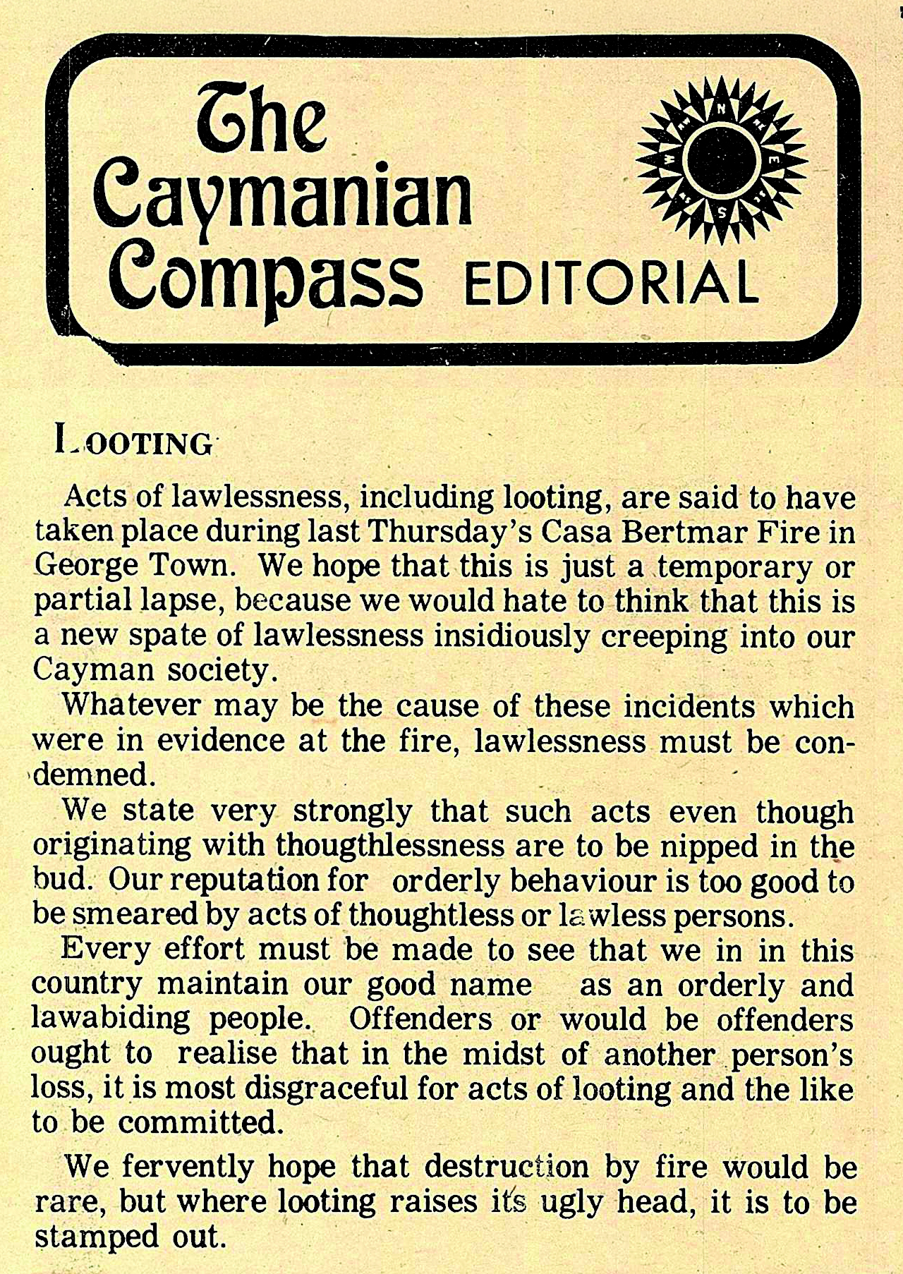 The editorial had a section on the reported looting during the Casa Bertmar fire, saying, “We hope that this is just a temporary or partial lapse, because we would hate to think that this is a new spate of lawlessness insidiously creeping into our Cayman society.” It also noted that whatever caused those actions, “lawlessness must be condemned”.