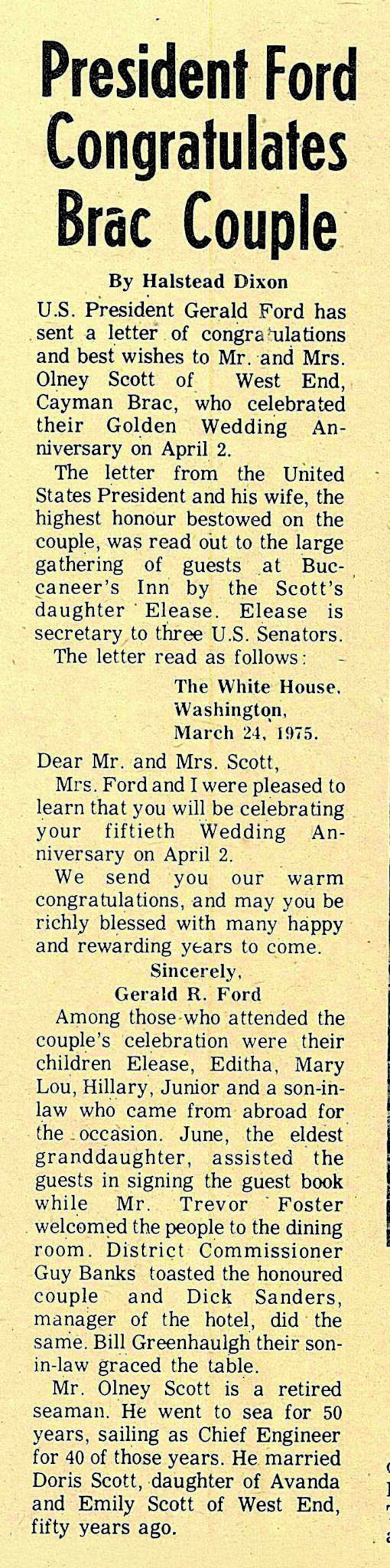 Another front-page story was about US President Gerald Ford congratulating Olney and Doris Scott on their golden wedding anniversary. Ford sent a letter on behalf of himself and his wife, Betty, saying they “were pleased to learn that you will be celebrating your fiftieth Wedding Anniversary on April 2”, adding “may you be richly blessed with many happy and rewarding years to come”. The Scotts’ daughter, Elease, who read the letter out at the celebratory gathering, was secretary to three US senators.