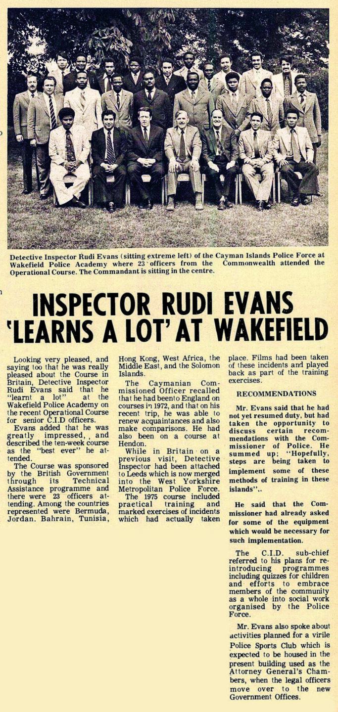Detective Inspector Rudi Evans returned from a course in the UK for senior CID officers, as reported in the 16 Oct. 1975 edition of The Caymanian Compass. One of 23 officers attending the course, from countries including Bermuda, Jordan, Tunisia, Hong Kong and the Solomon Islands, he said the 10-week programme was the “best” he’d ever attended. Though not yet back on duty in Cayman, Evans had been discussing certain recommendations with the police commissioner, adding he hoped steps were “being taken to implement some of these methods of training in these islands”.