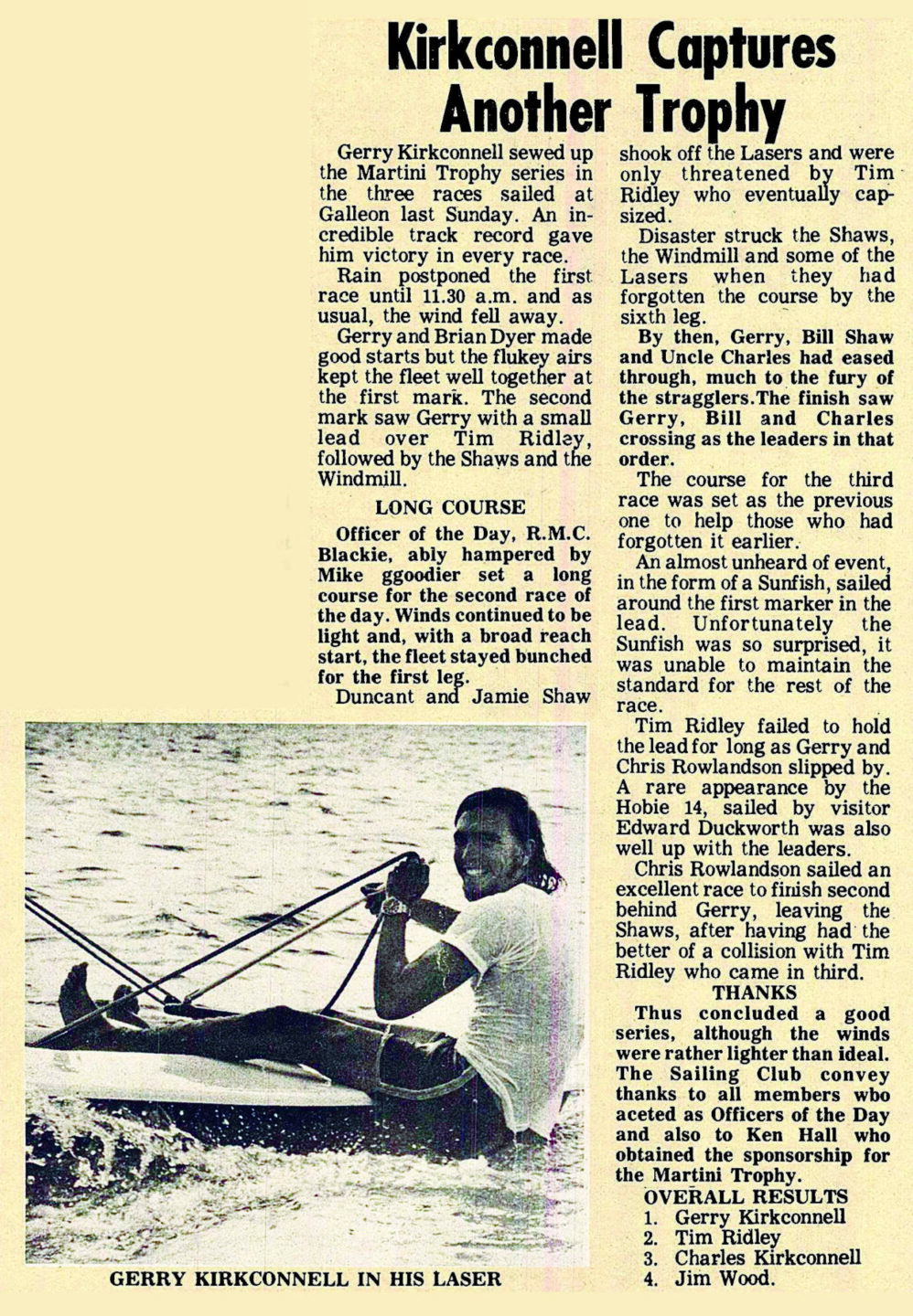 In sports news, sailor Gerry Kirkconnell earned another win, this time capturing the Martini Trophy after a three-race series. Kirkconnell, who was pictured in his Laser, was followed in the final standings by Tim Ridley, Charles Kirkconnell and Jim Wood.