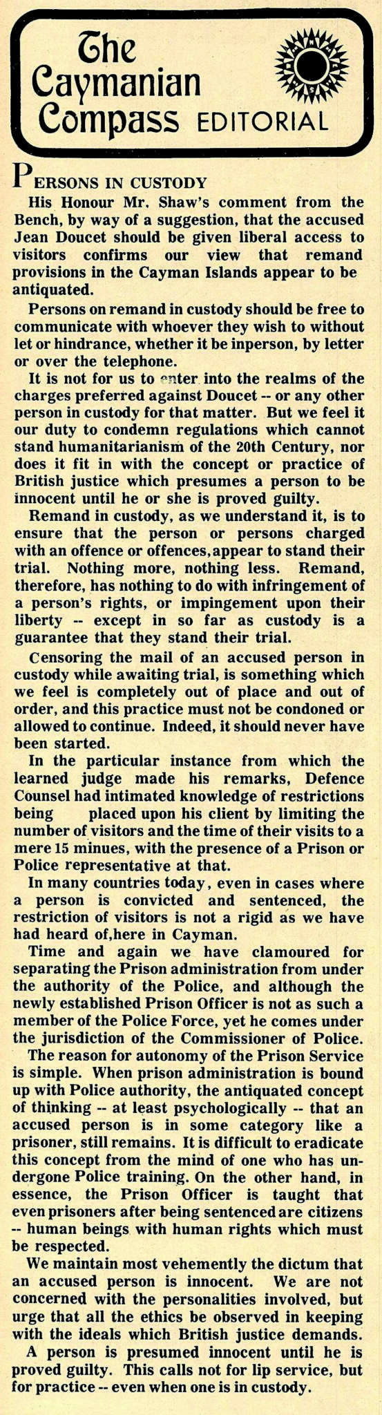 The first section of the editorial, ‘Persons in Custody’, referred to Jean Doucet, saying that “remand provisions in the Cayman Islands appear to be antiquated”. Doucet, who had been placed in Northward Prison on remand, was allowed four visitors a week for 15 minutes each in the presence of a prison or police representative, and allowed to call his wife and his brother once a week. “Persons on remand in custody should be free to communicate with whomever they wish to without … hindrance, whether it be in person, by letter or over the telephone”, the editorial said, concluding, “A person is presumed innocent until he is proved guilty. This calls not for lip service, but for practice – even when one is in custody.”