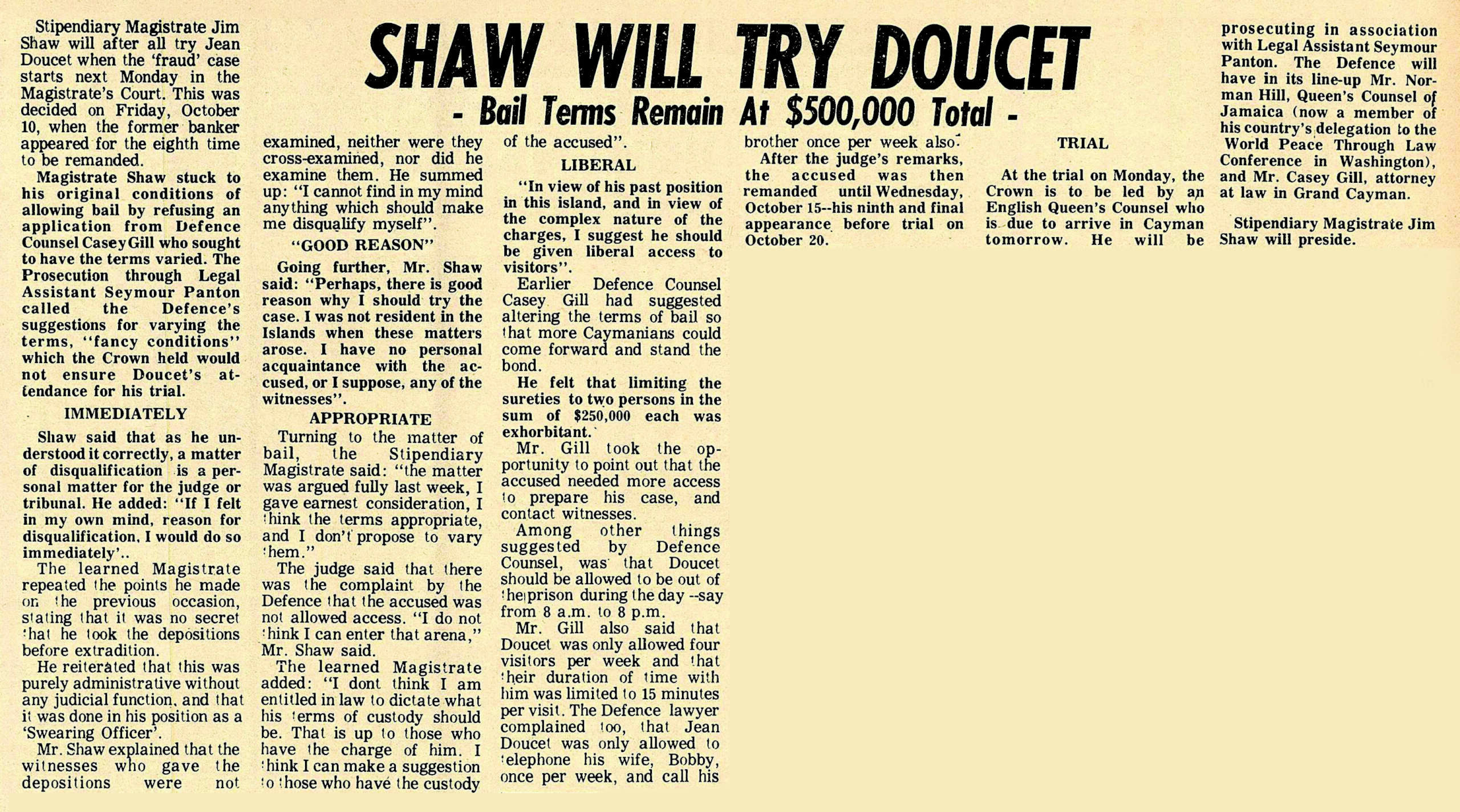 Following on from a front-page article about all the lawyers and witnesses flying in to Cayman for the Doucet trial, which was slated to begin 20 Oct. 1975, was this story, ‘Shaw Will Try Doucet’. Magistrate Jim Shaw, while sticking to the original conditions of remand, decided he would not recuse himself from presiding over the trial, saying, “If I felt in my own mind, reason for disqualification, I would do so immediately.”