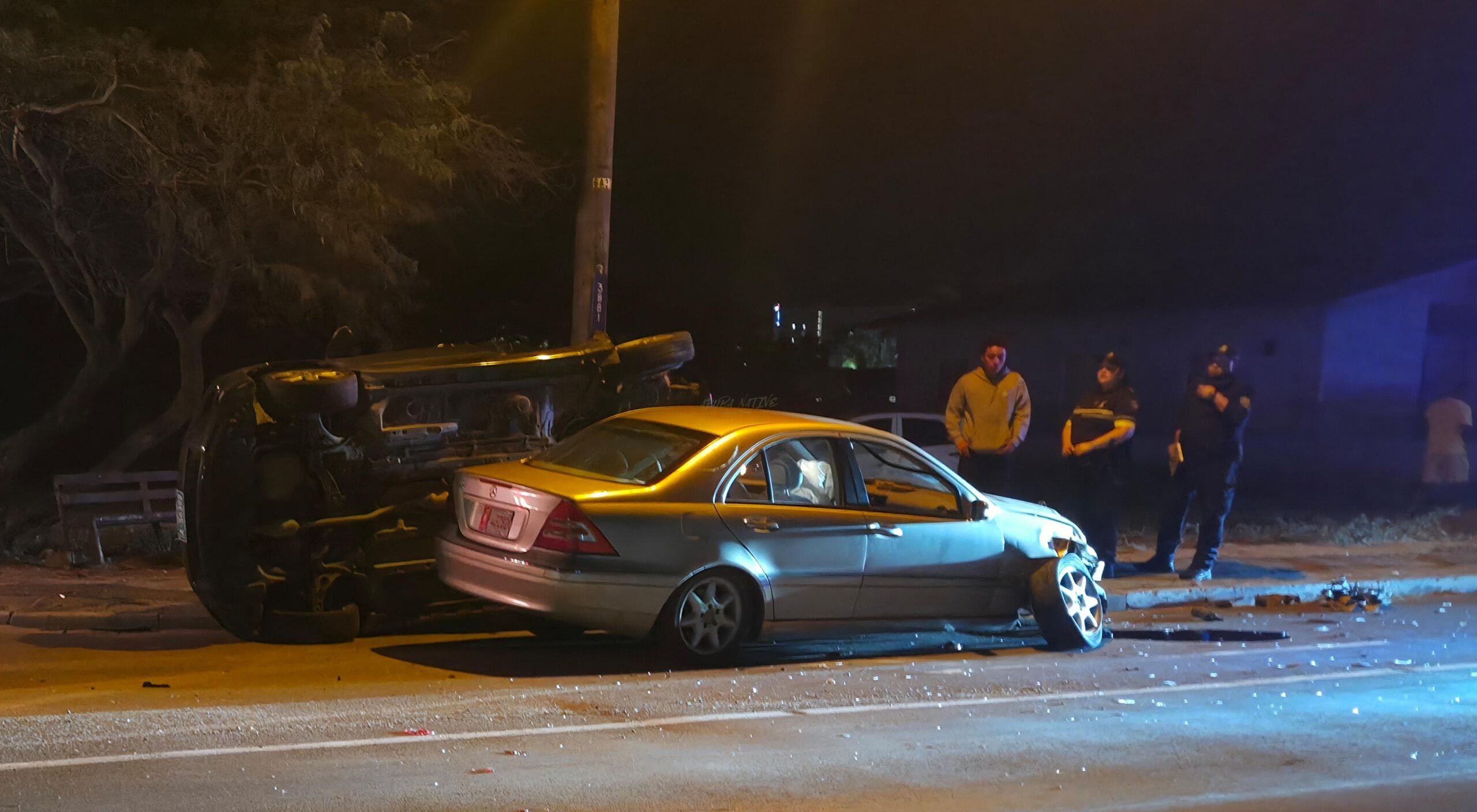 Na yegada agentenan a topa cu dos auto, un Mercedes-Benz y un Toyota Vitz. E impacto tawata uno duro, mirando con e Mercedes-Benz a klem e Vitz contra un palo di luz.