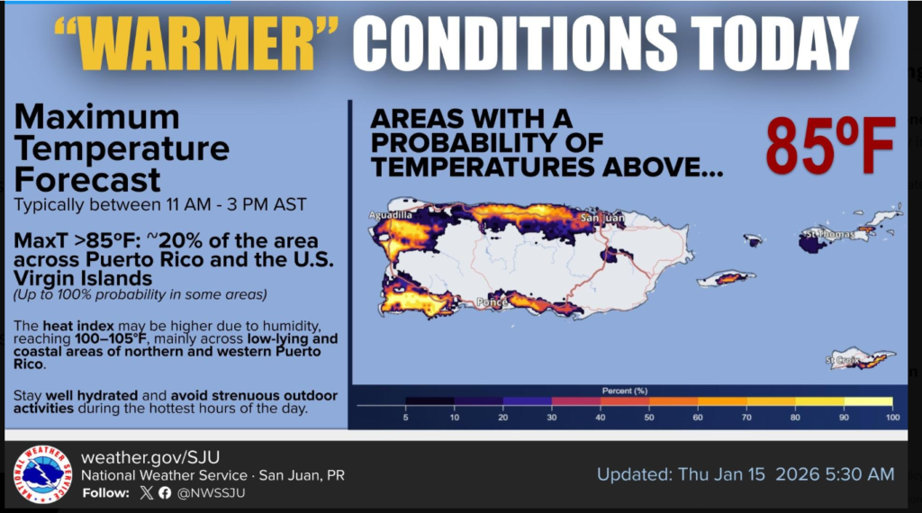 Highs upper 80s–near 90°F; heat index 100–105°F in low/coastal north and western Puerto Rico.