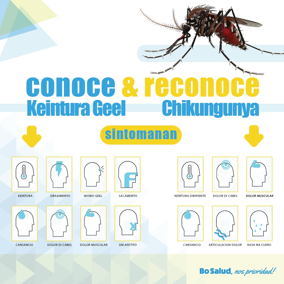 ORANJESTAD, Aruba – 30 maart 2026: Directie Volksgezondheid (DVG) ta informa comunidad riba e importancia di conoce y reconoce e diferente sintomanan di malesanan transmiti pa sangura, manera Chikungunya y Keintura Geel, pa asina por tuma accion na tempo y preveni complicacionnan serio.