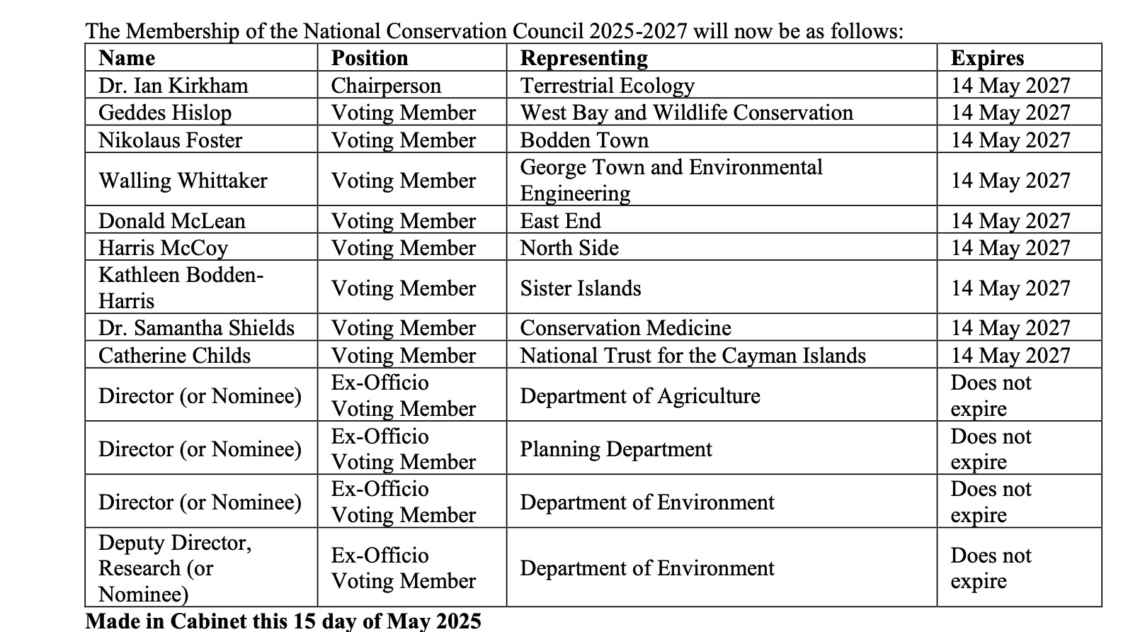 Among those appointed by the new government are environmental scientist Ian Kirkham, who will be chair; Geddes Hislop, a wildlife biologist who works at Cayman Turtle Centre; Walling Whittaker, former chief officer at the Department of Environmental Health; Catherine Childs, the National Trust’s Environmental Programmes manager; and Samantha Shields, dean of St. Matthew’s University School of Veterinary Medicine.
