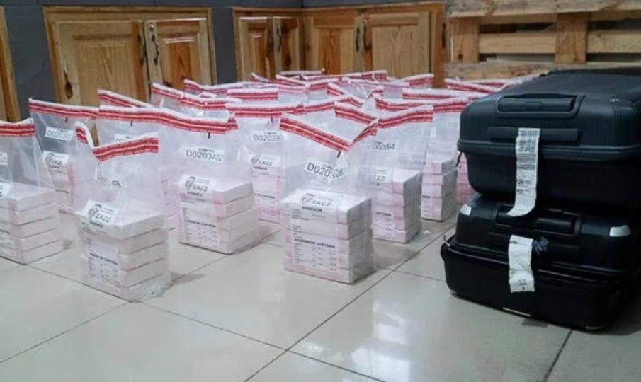 Authorities detected suspicious images in several suitcases during routine inspections using X-ray scanners. With support from military personnel and canine units, agents carried out a search and found 150 packages of cocaine hidden inside four pieces of luggage, wrapped in plastic and adhesive tape.