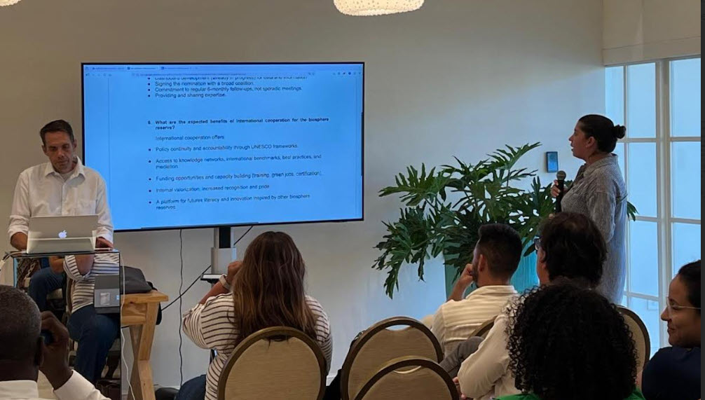 Ultimo siman di Augustus, nos a tuma un paso importante pa e meta aki. Nos oficina di UNESCO conhuntamente cu UNESCO Aruba a organisa un tayer na Aruba, pa institutonan di gobierno, sociedad civil, academia y industria. Gobernador di Aruba y Prome Ministro tabata presente. E mensahe tabata cla: gobierno su so no por crea un reserva biosfererico. E ta solamente un exito ora tur hende por mira nan reflexion den dje; piscador, agricultor, maestro, guia turistico, empresarionan, y hubentud. Nan tradicion, conocemento, y creatividad ta transforma e concepto den un realidad bibo.