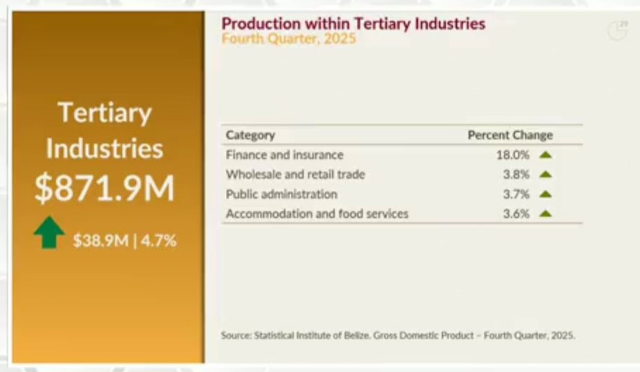 By Aaron Humes: The tertiary sector was the largest contributor to economic growth for the period. Production within this sector totaled $871.9 million in the fourth quarter of 2025, up 4.7 percent or $38.9 million from $833.1 million in the fourth quarter of 2024.