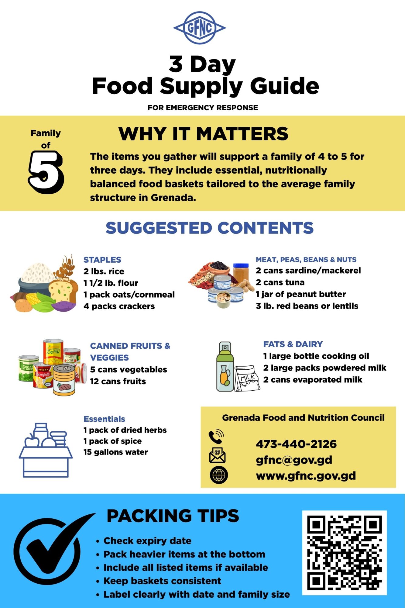 The Grenada Food and Nutrition Council (GFNC) has released its new 3-Day Food Supply Guide posters. It is a timely and practical tool to help every household prepare and be food secure before disaster strikes.