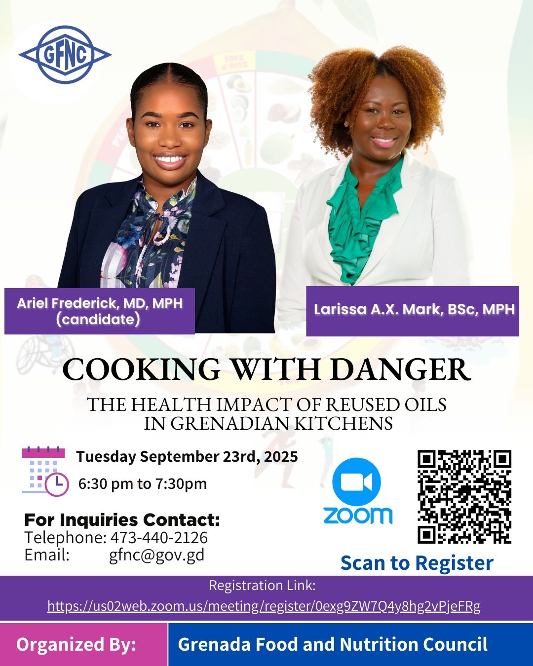 The Grenada Food and Nutrition Council (GFNC) invites the public to a timely and eye-opening free webinar entitled “Cooking with Danger: The Health Impact of Reused Oils in Grenadian Kitchens” on Tuesday, 23 September 2025, from 6:30 pm to 7:30 pm, online via Zoom.