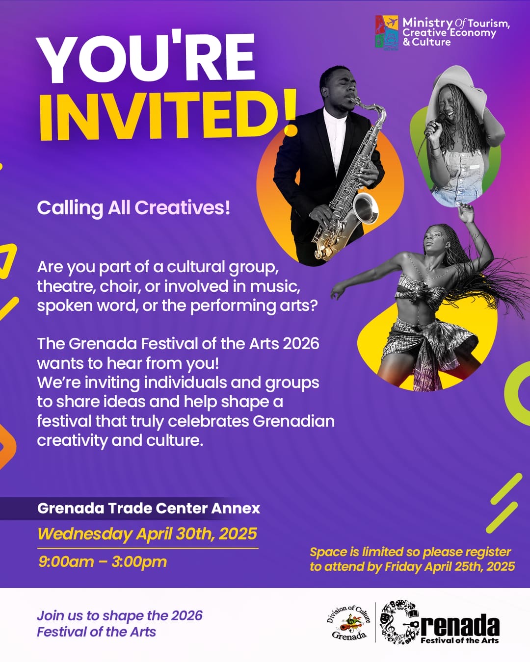 The Division of Culture invites all interested persons to attend. This includes members of cultural organisations, drama and theatre groups, church and community choirs, vocalists, vocal coaches, music teachers, spoken word poets, and musicians. Register here.