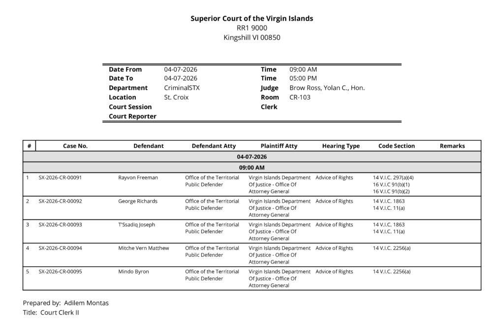 - Rayvon Freeman (Case No. SX-2026-CR-00091) appeared on charges of Third-Degree Assault and Domestic Violence.