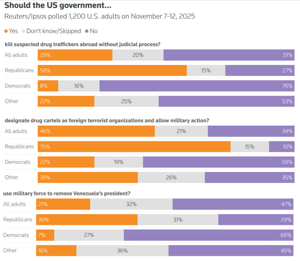 The six-day poll, which closed on Wednesday as Washington continued a military buildup around Latin America that has focused especially on Venezuela, showed 51% were opposed to the killings of drug suspects and the rest were unsure where they stood.