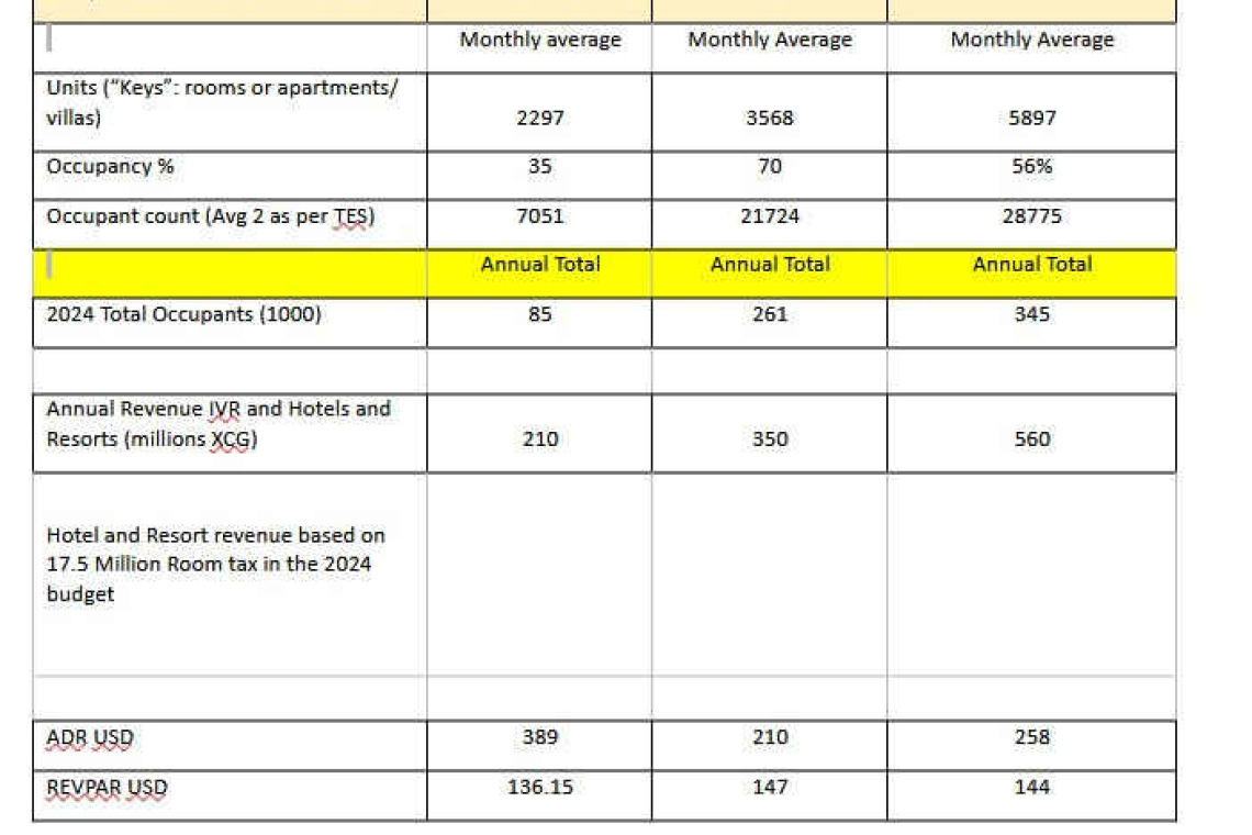 Together, these visitors generated an estimated XCG 560 million in revenue, of which XCG 350 million came from hotels and resorts and XCG 210 million from vacation rentals. Revenue estimates for hotels and resorts are based on the XCG 17.5 million in room tax included in the 2024 national budget, equating to a revenue per available room (RevPAR) of US $147. Vacation rentals were calculated at a RevPAR of $136.15.