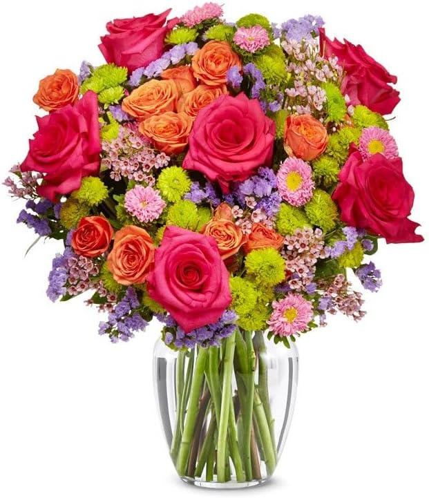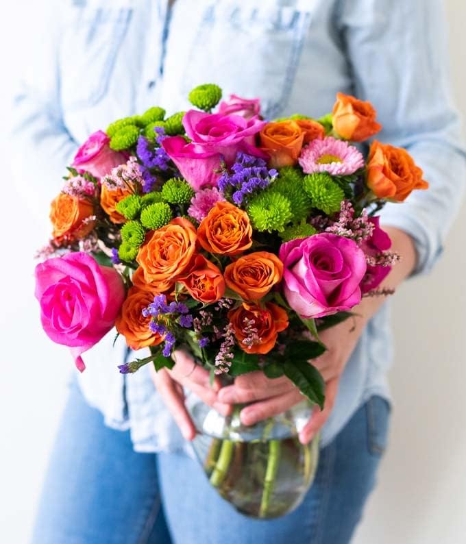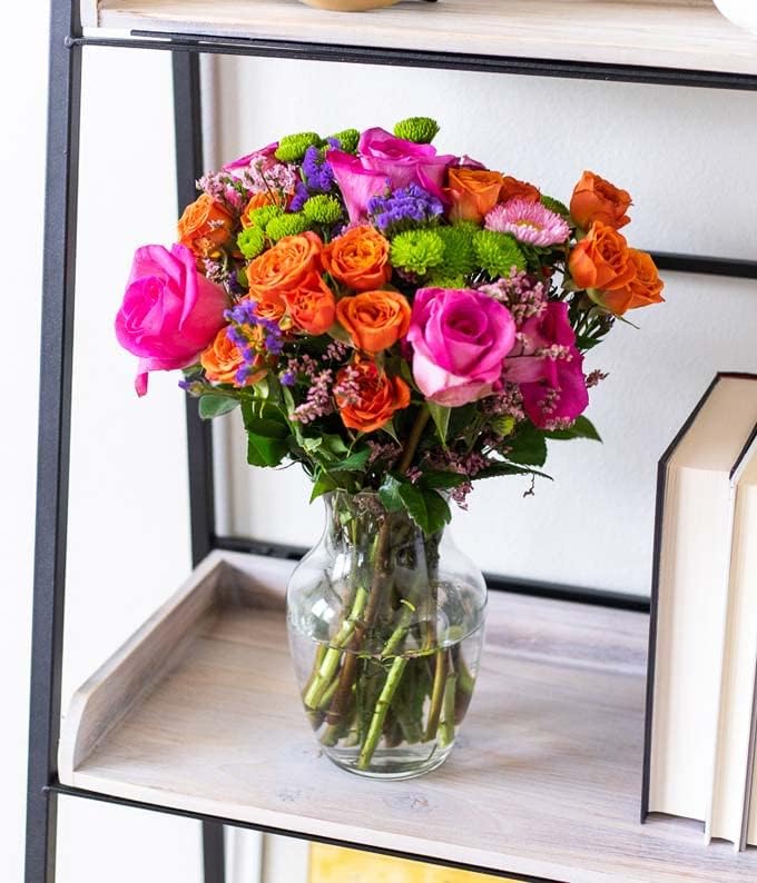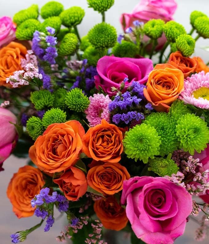 Includes: Pink Roses, Orange Mini Roses, Pink Waxflower, Green Button Poms, Pink Matsumoto Asters, Lavender Statice + Free Glass Vase