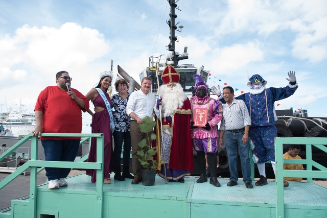 Diadomingo atardi, hunto cu un multitud di mayor y mucha, Prome Minister mr. Mike Eman hunto cu Minister di Vivienda drs. Rene “Baba” Herdé, a duna Sinterklaas y su Pietnan cu su Zwarte Pietnan un caluroso bonbini. E entusiasmo tabata hopi grandi cerca e chikitinnan pa por a wak Sinterklaas yega, auke algun tabatin tiki miedo pa Pietnan no hibanan Spaña.