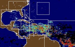 An image from the university’s satellite-based Sargassum Watch System published on 8 May shows large amounts of sargassum building up in the western Atlantic and eastern Caribbean Sea.