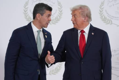 US President Donald Trump greets Paraguay’s President Santiago Pena during a summit on Gaza in Sharm el-Sheikh on October 13, 2025.