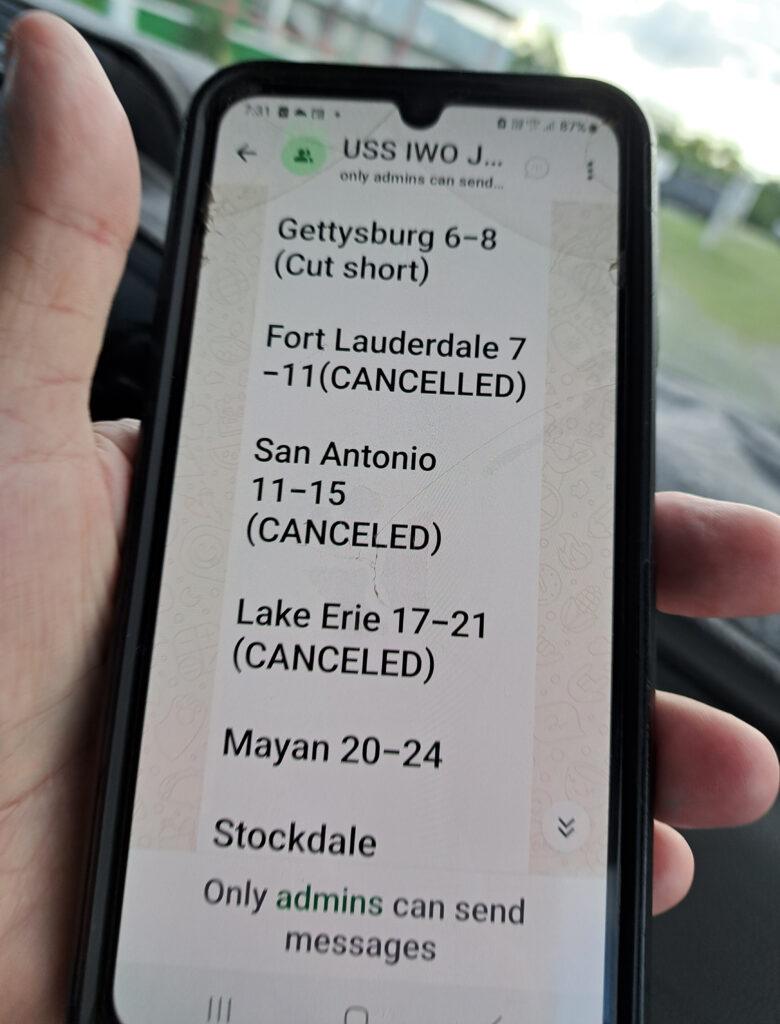 The text message alerts—sent to local transport coordinators who assign “van missions” for naval personnel—confirm that visits for the USS Lake Erie (March 17–21) and the USS Mayan (March 20–24) have been marked “CANCELED”.